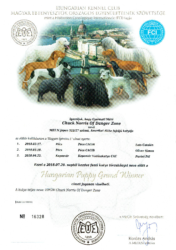 Dam / Anya: JCH-CH-SCH-GCH HU, C.I.B. J., HPGW, HMPGW Ironaya Of Danger Zone a.k.a RONY