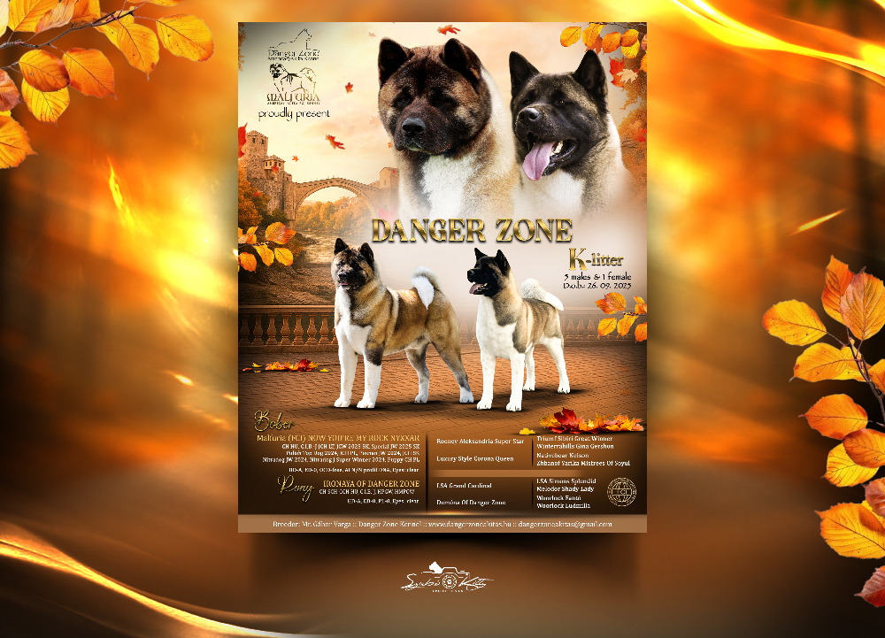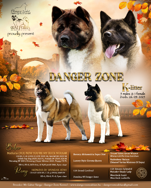 Sire / Apa: CH AT, CH HU, C.I.B-J, JCH LT, J. CW 2025 SK, Special JW 2025 SK, Polish Top Dog 2024, JCH PL, Poznan JW 2024, JCH SK, Nitradog JW 2024, Nitradog Super W 2024, Puppy CH PL Malfuria (FCI) NOW YOU’RE MY ROCK NYXXAR a.k.a BOBER