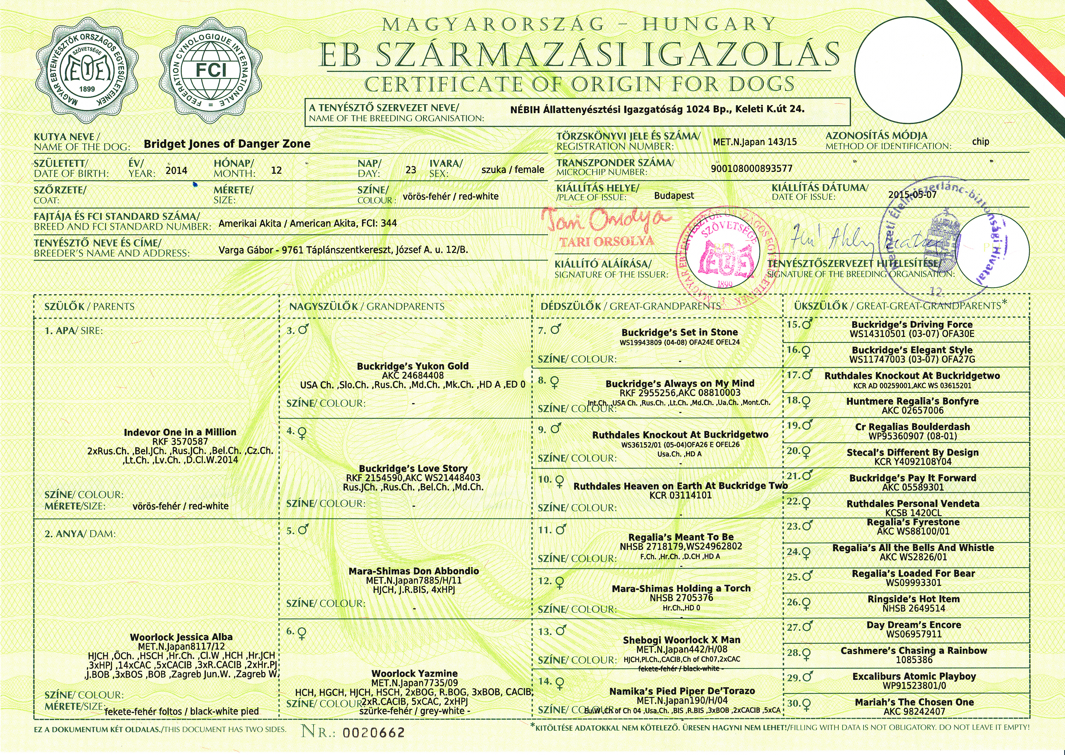 Dam / Anya: Croatian and Hungária Junior Champion; MESZ Hungária, Österreichischer, Hungária, Hungária Show, Croatian Champion, Int.CH Woorlock Jessica Alba