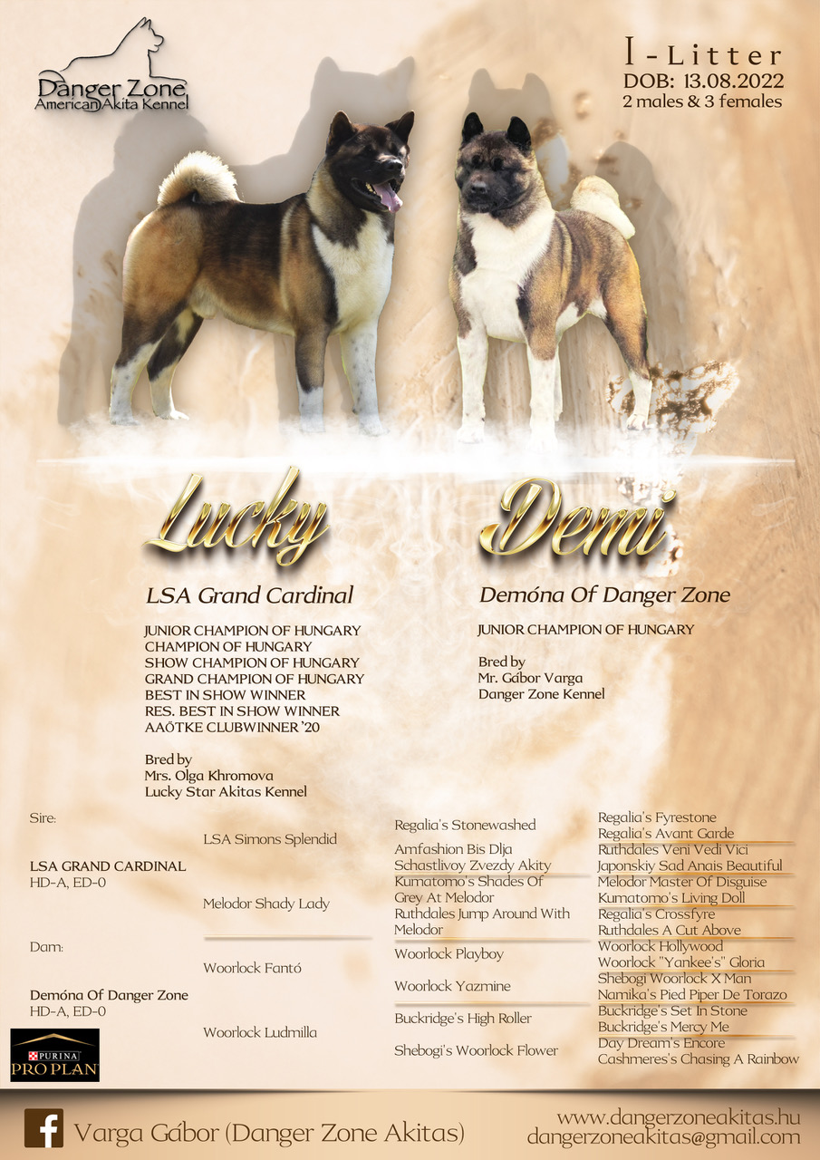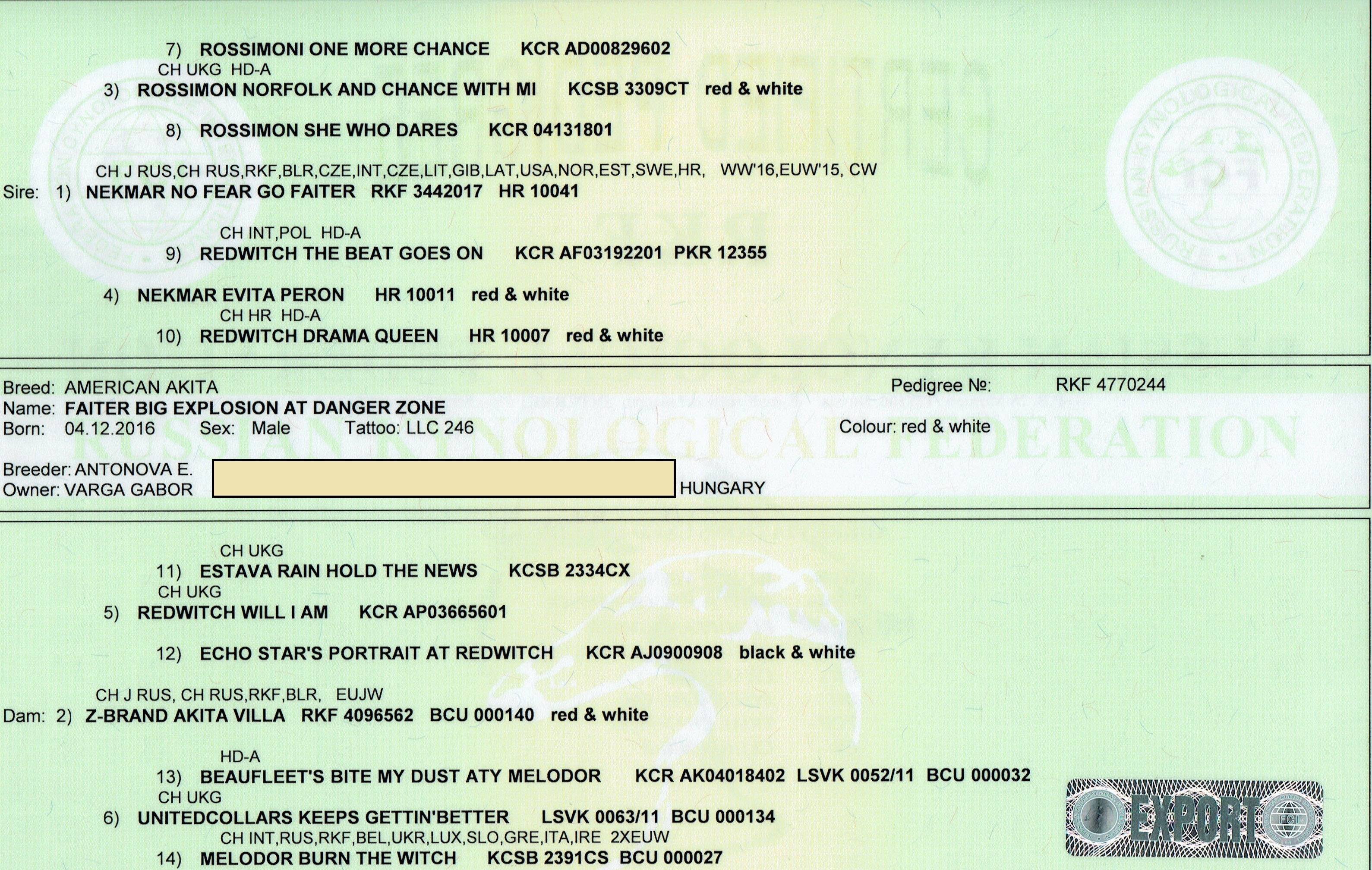 Sire / Apa: Russian, Belarus and Schwitzerland Junior Champion; Russian, Czech, Belarus, Lithuan and Hungaria Champion, Akita Club Germany Winner, EDS '14 Club Winner, Int.CH Indevor One In A Million